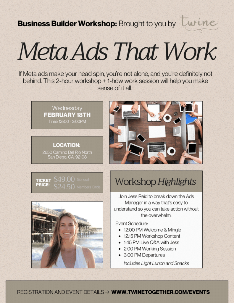 Do Not Miss Out: Jess is a pro at driving highly targeted leads into small businesses right here in San Diego! She coaches this content on a 1:1 basis for 10x the price of this event. This experience is designed for solopreneurs, small business owners who are ready to work smarter, not harder through effective ad campaigns. Limited to just 12 seats, this workshop is expected to fill quickly!
