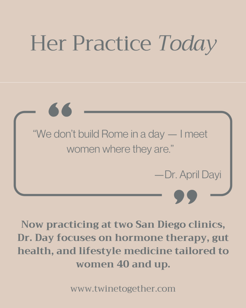 Now, as a naturopathic doctor herself, Dr. Day helps women over 40 move through perimenopause, menopause, and beyond with holistic, personalized care.