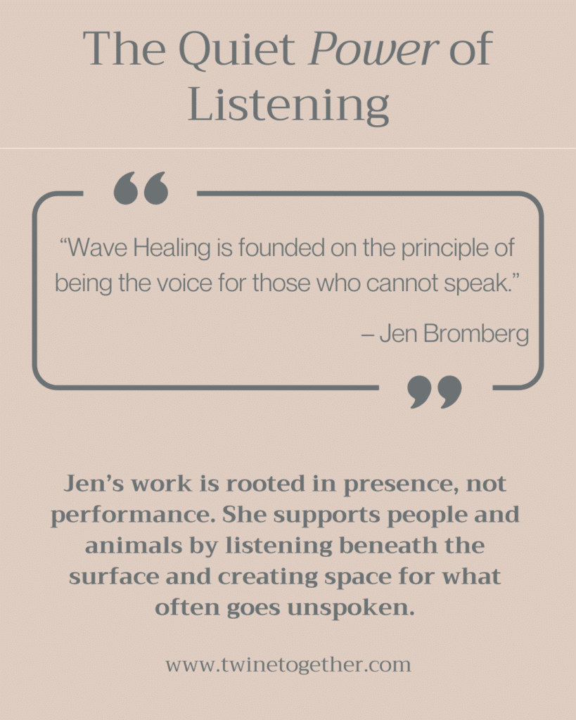 Jen’s work is a reminder that healing does not have to be loud, dramatic, or rushed to be meaningful. Through Wave Healing, she creates space for people and animals to be seen, supported, and understood in ways that often go unnoticed. Her work invites a different kind of leadership, one rooted in presence and trust, where real change happens not by pushing harder, but by listening more closely.
