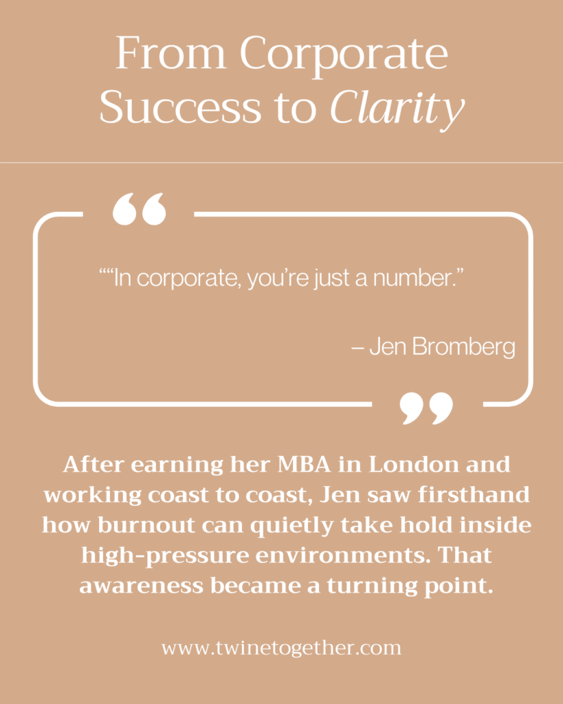 Jen’s understanding of burnout isn’t theoretical, it’s lived. After earning her MBA in London, she moved swiftly into corporate America in New York City. She understands the pace, the pressure, and the unspoken expectations that often come with success.