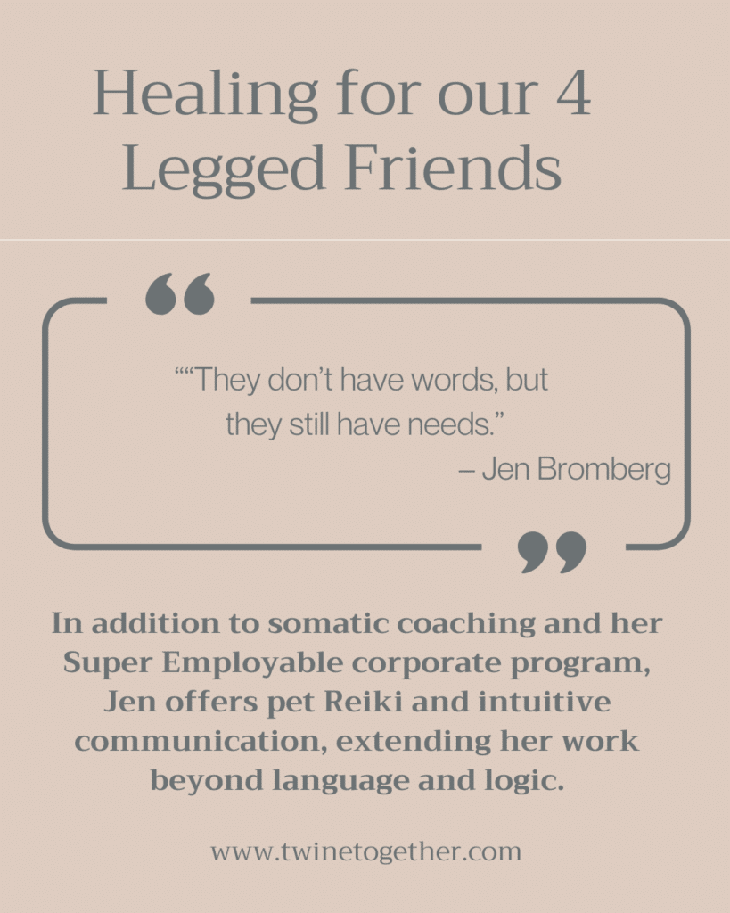 Jen also works with animals, offering Reiki and intuitive communication to support pets and their humans. This work reflects her belief that healing extends beyond language.