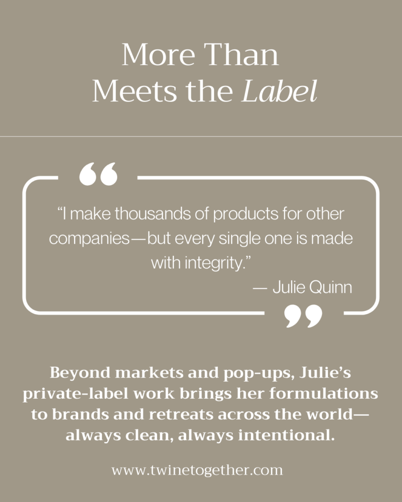 At the heart of Quinntessentials is Julie herself—a creative, lifelong learner who blends plant wisdom, product integrity, and community connection into everything she does. Whether she’s formulating in her studio, chatting with customers at a local market, or helping other brands bring their ideas to life, Julie’s work is grounded in purpose: to help people feel good, naturally.
