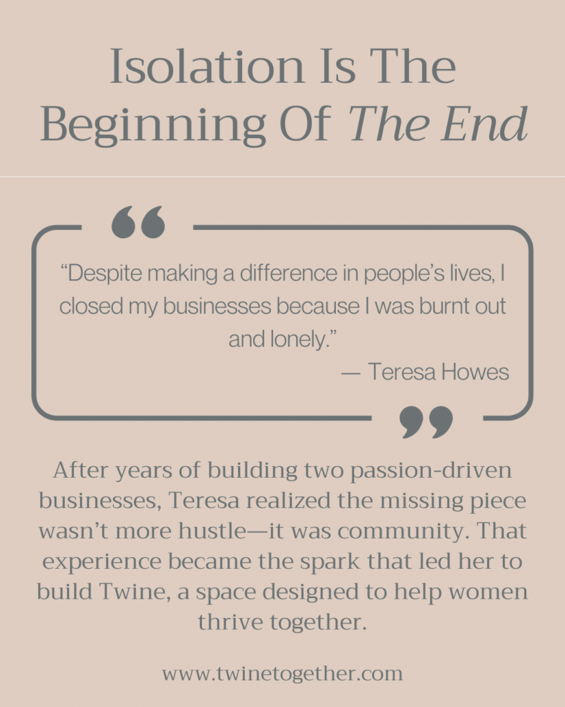 After spending more than a decade building two passion-driven businesses, Teresa Howes came face-to-face with something she hadn’t anticipated: loneliness. Despite making an impact with her clients, Teresa found herself running out of energy, motivation, and connection—and eventually exited both businesses. That experience planted the seed for something new, Twine, an event based marketing platform to connect women in business with each other and conscious consumers.